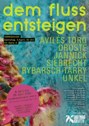 Im April 2026 zeigt Die Galerie “ Der Kunstbetrieb“ im Hans A in der Hansastraße die Ausstellung „dem fluß entsteigen“. Präsentiert werden künstlerische Positionen von Dortmunder Künstler*innen aus Malerei, Plastik, Grafik, Video und Fotografie. Mit Arbeiten von Ana Maria Avilés Toro, Anke Droste, Anne Jannick, Brigitte Felician Siebrecht, Almut Rybarsch-Tarry und Udo Unkel. In Kürze berichten wir mehr.